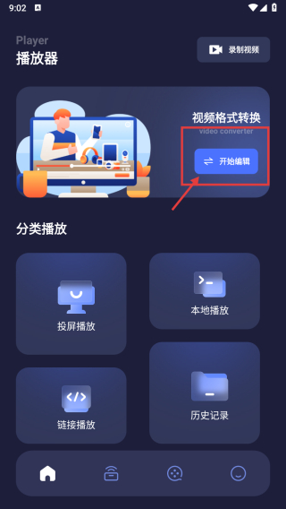 1、打开播放器APP,点击视频格式转换板块的开始编辑按钮,进入视频选择页面。