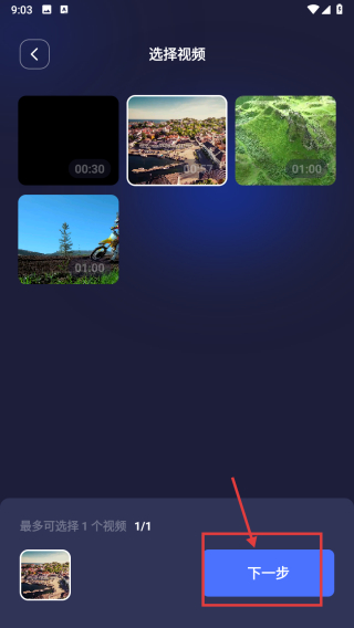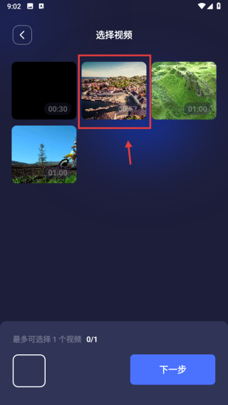2、在视频选择页面,选择需要转换格式的视频,完成视频选取操作。