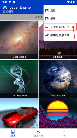 2、在排序选项中,选择按字母顺序升序,调整壁纸列表排序方式。