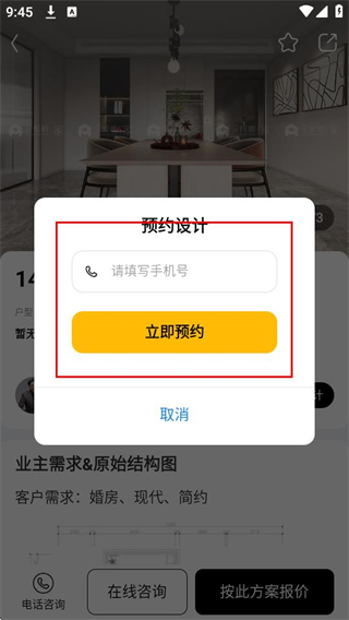 4、在预约设计页面,填写手机号后点击立即预约可完成设计预约。