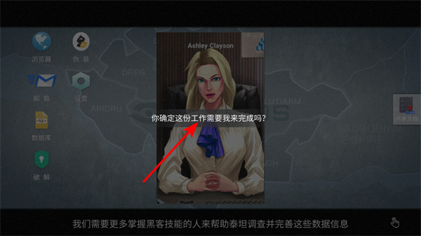 2、在与Ashley Clayson的对话中,留意剧情提示,明确自身的任务职责,为后续开展黑客调查工作做好准备。