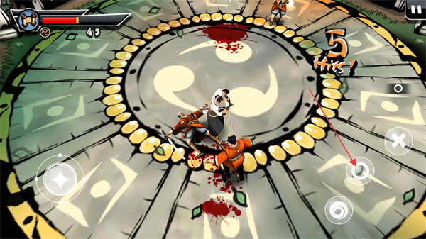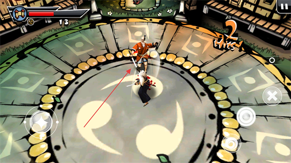 1、操控武士移动,利用左侧虚拟摇杆在场景中行走,接近敌人。