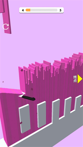 1、操控切片工具切割粉色障碍物,通过切割减少其高度,推进关卡进度上方进度条显示当前关卡从2向3推进。