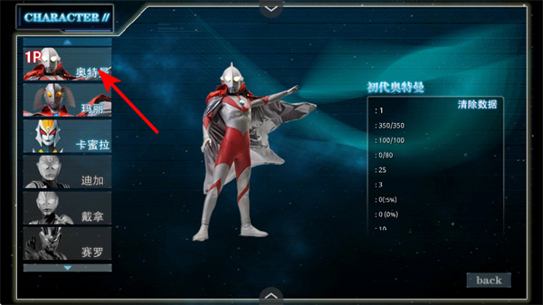 1、在角色选择界面,点击奥特曼角色,选择初代奥特曼开启游戏,是经典奥特战士,拥有强大的战斗能力,是得力选择。