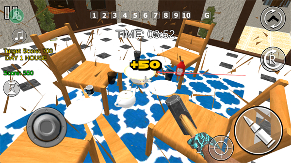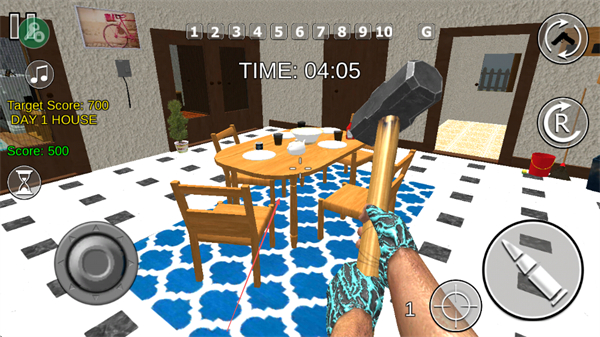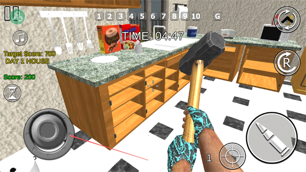 1、操控角色手持锤子,在厨房等场景破坏橱柜、家电等物品,每破坏一处可获得分数。