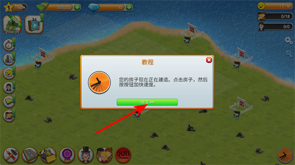 1、在游戏教程界面,点击继续按钮,跟随教程了解房子建造的加速操作,这是掌握建筑建造节奏的关键步骤。