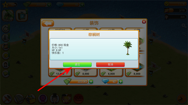2、在装饰界面,选择棕榈树等装饰建筑,点击建造按钮,为城市添加装饰元素,提升城市的美观度和居民快乐值。