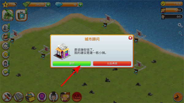 4、在城市顾问建议界面,点击进行按钮,按照建议建造建筑,如小栋房屋,推动经济发展人口增长,完善城市建设。