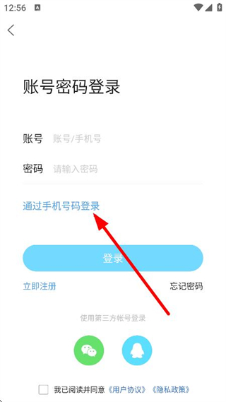 3、在账号密码登录界面,点击通过手机号码登录,进入手机号输入页面。