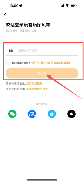 2、在登录页面,输入手机号,勾选同意后点击下一步。