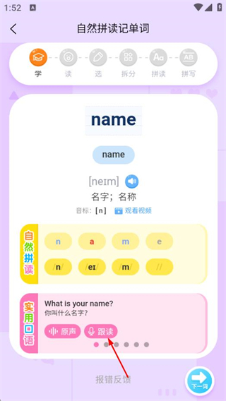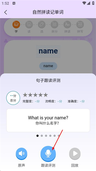3、在单词学练界面,点击跟读,可进行句子跟读练习。