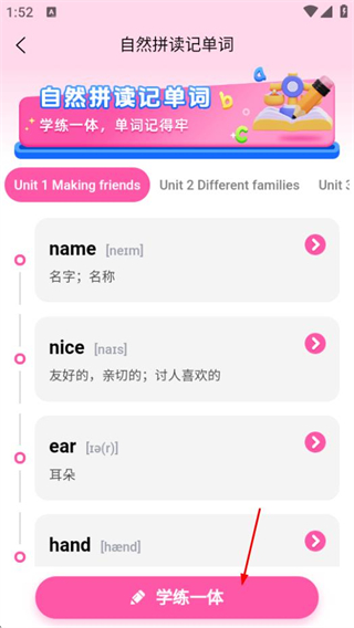 2、在单词学习页面,点击学练一体,进入单词学练界面。