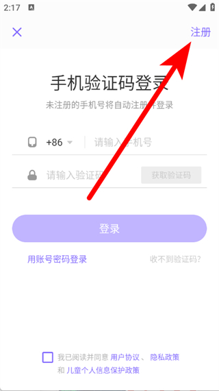 2、在个人页面,点击注册登录区域,进入手机验证码登录页面。