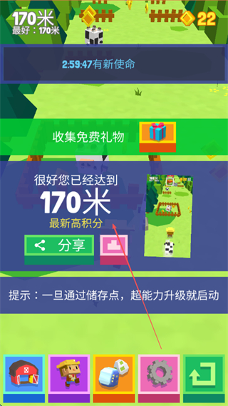 4、达到一定距离如170米后,获得最高积分评价,可收集免费礼物,继续挑战更高距离。