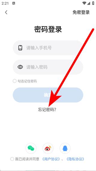 2、在密码登录页面,点击忘记密码,进入忘记密码页面。