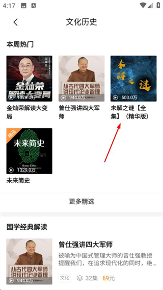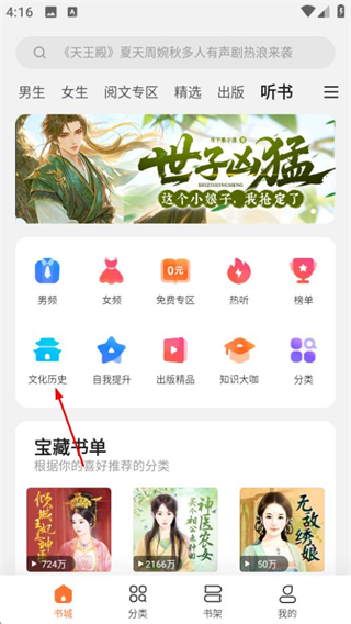 2、在听书频道页面,点击文化历史分类,进入文化历史听书列表页面。
