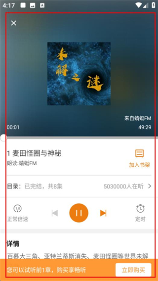 4、在听书播放页面,即可收听未解之谜第一章的麦田怪圈内容。
