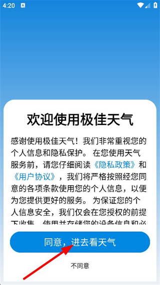 1、在欢迎使用极佳天气弹窗中,点击同意,进去看天气,进入主界面。
