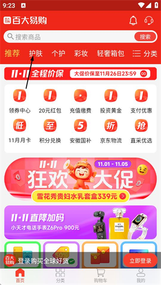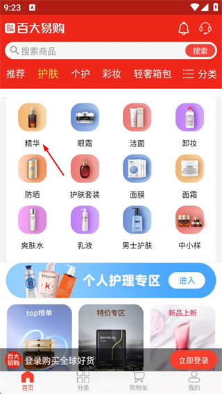 1、打开百大易购,在首页点击护肤,进入护肤分类页面。