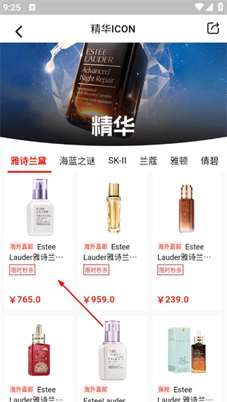 2、在护肤分类页面,点击精华,进入精华商品列表页面。