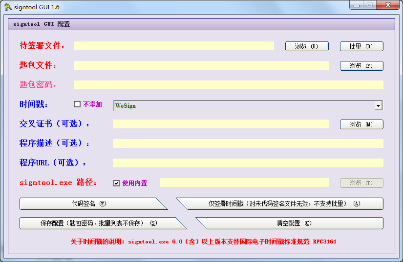 2、交叉证书:程序中已经有说明,请在专业人士指导下使用,否则代码签名会失败,一般用户无需例会,留空即可。