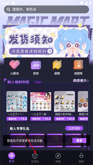 1、打开魔力玛特,在首页点击买周边,进入周边购买页面。