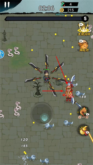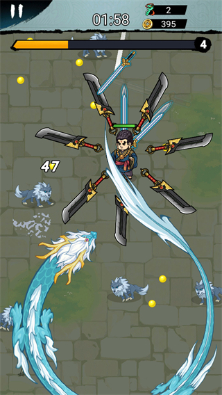 1、战斗场景中,操控角色攻击狼、敌人等,收集铜钱,推进战斗进程。