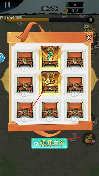 2、击败敌人后开宝箱,获取铜钱、道具等资源,助力游戏发展。