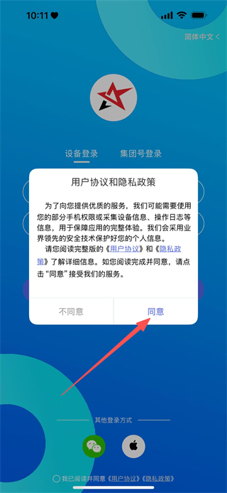 1、在用户协议和隐私政策弹窗中,点击同意,进入登录页面。