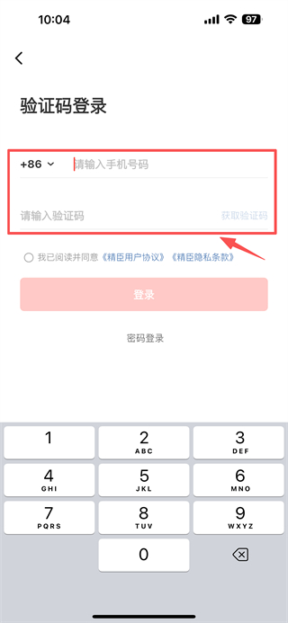 4、在验证码登录页面,填写手机号码、获取并输入验证码,勾选同意精臣用户协议精臣隐私条款后,完成账号登录操作。