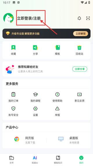 2、在个人中心,点击立即登录/注册选项,进入登录方式选择页面。