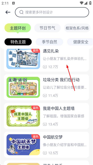 2、在环创设计页面,选择心仪主题如遇见扎染,进入主题详情页面。