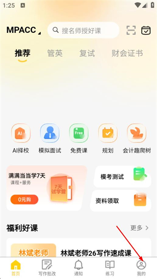 1、打开数大仙考研,在首页点击我的,进入个人中心页面。