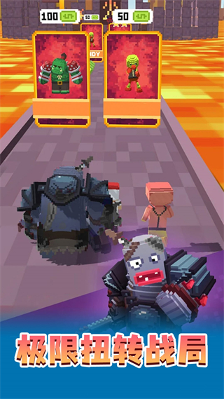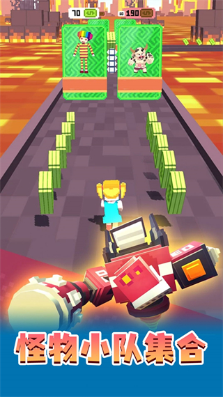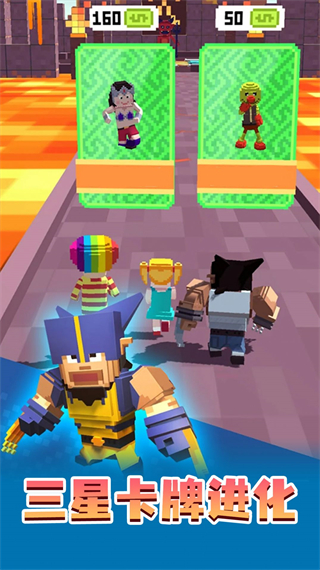2、在关卡内,需要操控角色左右移动收集金钱购买怪物进行合成升级。