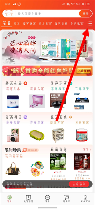 1、打开蚁商时代,点击首页右上角菜单按钮,进入商品分类页面。