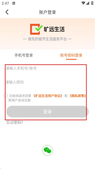 4、在账号密码登录页面,输入信息,同意协议后点击登录,完成账号登录。