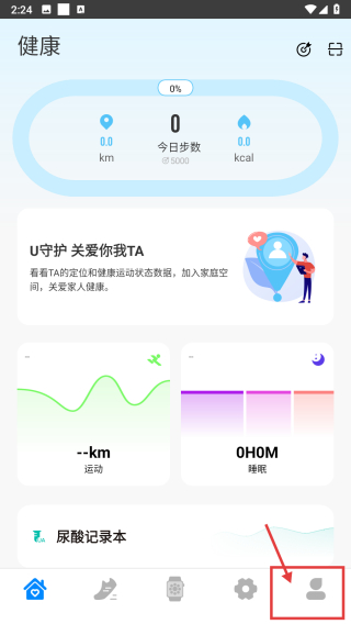 1、打开健康管理类APP首页,点击底部我的选项,进入个人中心页面。