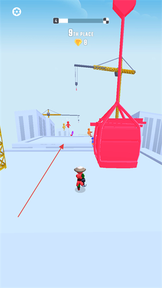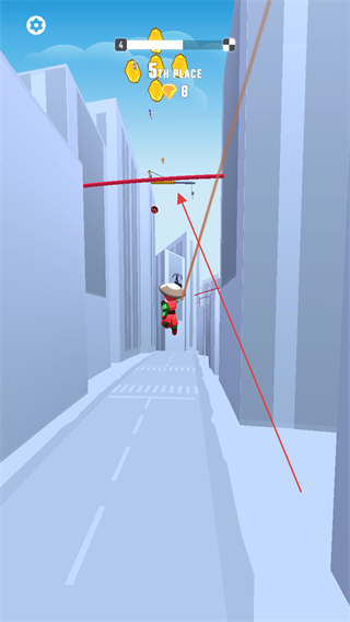 2、用飞钩抓住红色横杆荡行,收集金币,提升排名。
