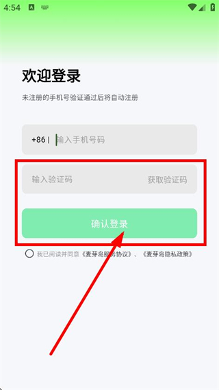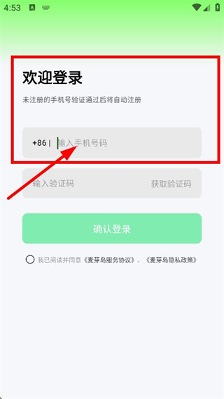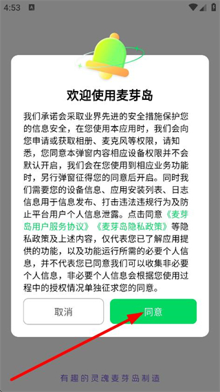 1、在欢迎使用麦芽岛的弹窗中,点击同意,进入登录页面。