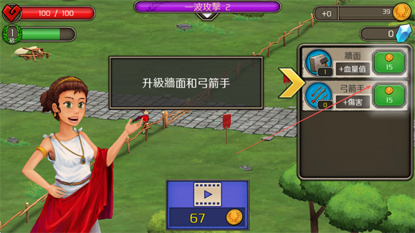 1、在一波攻击2中,消耗金币升级墙面提升血量值和弓箭手提升伤害,增强防御能力。