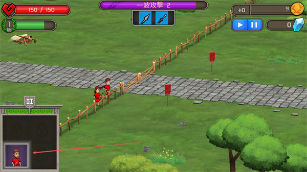 2、点击左侧士兵单位,将其放置在石板路的防御位置,阻挡敌方进攻。