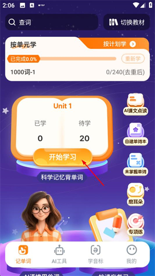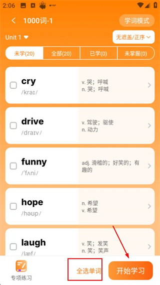2、在单词列表页面,点击开始学习按钮,进入单词学习页面。