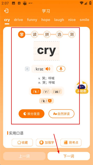 3、在单词学习页面,可学习单词的发音等,点击下一词可学习下一个单词。