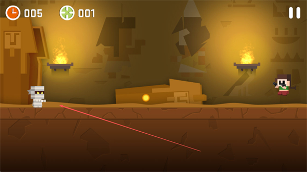 1、操控角色在古墓中移动,攻击如木乃伊等怪物,收集道具提升击杀数。