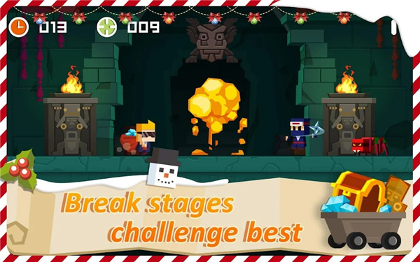 古墓英雄无限钻石是一款盗墓题材的动作作品,采用复古像素风格与横版2D画面呈现,角色及墓室怪物均为方块造型,背景色彩偏黑暗,搭配泛黄火光营造出恐怖墓穴氛围,操作采用触屏操控,手指点击屏幕左右两边即可控制主角射击,需注意射击方向与点击方向一致,但主角身体会向反方向跳跃,在惊险的墓室探索中展现动作操作的独特乐趣。