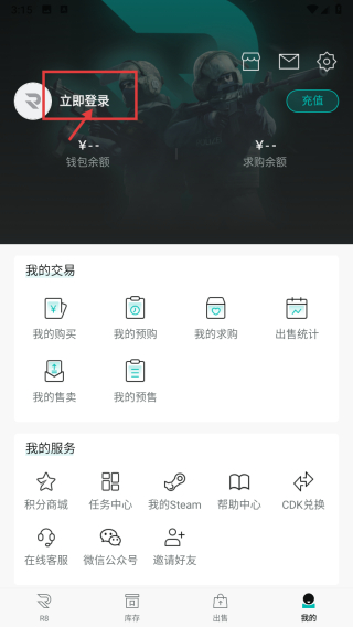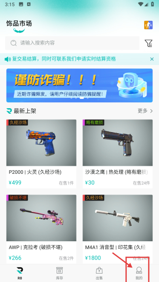 1、打开游戏饰品交易类APP首页,点击底部我的选项,进入个人中心页面。
