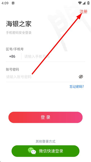 1、在海银之家登录页面,点击右上角注册,进入注册页面。