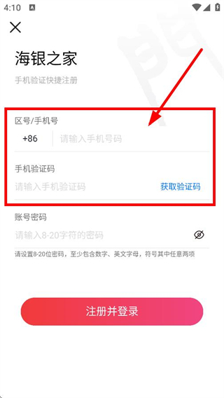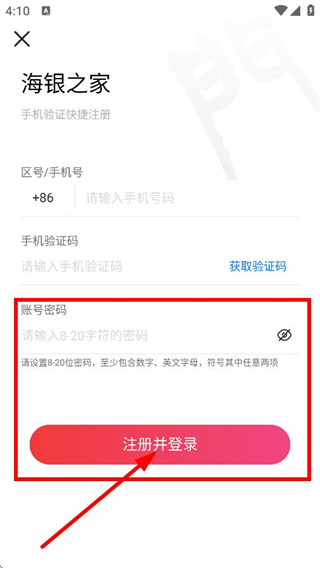 3、在注册页面,设置账号密码后,点击注册并登录,完成账号注册操作。