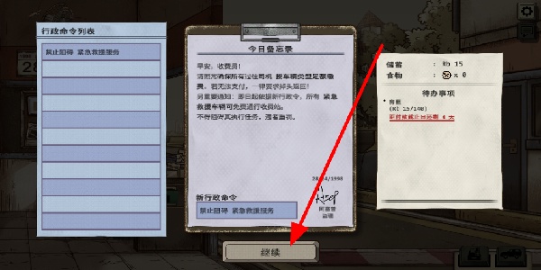 1、查看备忘录,详细了解当日行驶命令和各项注意事项,为收费工作做好充分准备,有序推进游戏进程。