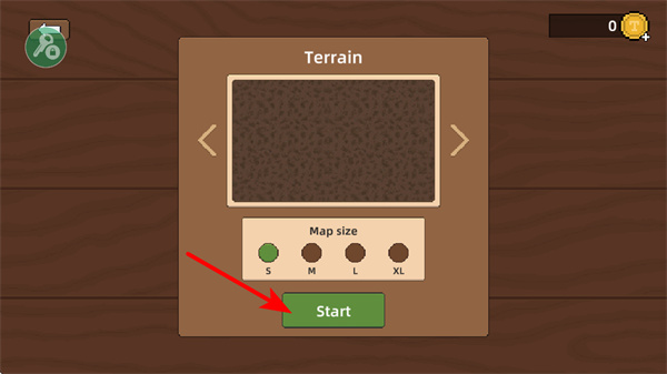 1、在游戏中,点击Start按钮开始游戏,这是进入地图建设和战斗环节的关键操作,选择地形尺寸开启游戏。
